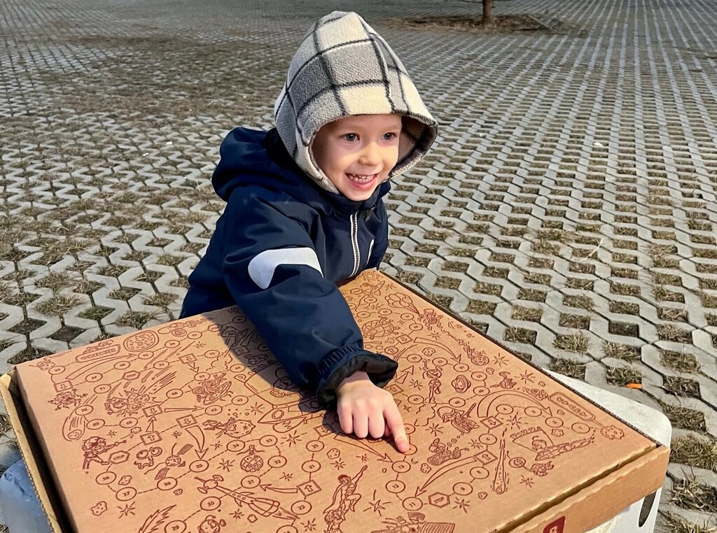 Огромная пицца с игрой на коробке, на которой запекаются 6 сегментов: мясная, чикен, пепперони, сырная, маргарита, детская