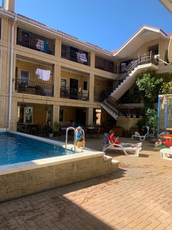 Были в середине августа 2025 года. Выбирали гостевой дом по отзывам и главным критерием было наличие бассейна, так как ехали с ребенком. Кто, также как и я, планирует плавать в бассейне, имейте ввиду, что он холодный. Об этом говорили все постояльцы, которые там жили. Бассейн расположен внутри двора и солнце практически на него не попадает, поэтому и не прогревается. В остальном место неплохое, компанией наверное вообще отлично там поселиться. Чисто, есть игровая зона для детей, мангал, все номера свежие, мебель в хорошем состоянии. Да, от моря далековато, но рядом магнит, КБ не так далеко, столовые и дорога на море и обратно не «в гору». 15-20 минут и вы на месте. В целом впечатление положительные, за исключением бассейна.