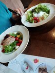 Возможно я кого- то сейчас разочарую. В целом кафе уютное, если не считать мух, которые там летают летом(( Раньше зимой заглядывали туда на бизнес- ланч, все было вполне нормально. В отличии от этого раза, всю картину испортил официант Михаил, чистейшей воды недоразумение, в прямом и переносном смысле, вместо слов извините, говорил "соболезную" что резало нам слух, но этот момент мы сочли за его безграмотность. Официант шушукался и смеялся с официантками и админом заведения, видимо им интересно обсуждать гостей кафе. Неужели они думают, что гости не замечают этой дичи. Принёс не тот заказ, по части одного блюда, потом с пеной у рта начал что- то говорить, побежал оправдываться перед администратором. Если кухня накосячила иди и разговаривай с кухней и не посвящай в эти проблемы гостя, а принеси то, что следует по заказу. Честно скажу, если таких официантов как он не будет, заведение ничего не потеряет) Касательно самого заказа, кроме вкусной лазаньи и крем- супа, всё было невкусным и порции оформлены не аппетитно, набросали из овощей три кубика огурцов. Грудка фермерского цыпленка оказалась жесткая, заветренная, будто трехдневной давности, а четыре небольших равиоли размазаны по тарелке, еще тарелка обычного борща за лошадиную цену- 580 р. Данное заведение не рекомендую, пусть повышают свой уровень для начала. Выше тройки пока не тянут. Есть много других заведений рядом.