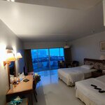 A large hotel with a well-maintained territory. There are two swimming pools on the territory (the first is located on the ground floor next to the dining room, the second is under the open sky next to the water park), there is also its own small water park (300 baht entrance ticket) and an amusement park. At the top there is a panoramic restaurant with a rotating mechanism, rotating 360 degrees, where the food is all inclusive. The hotel itself is quite old, the rooms are cleaned satisfactorily, although every day. The staff is helpful, but almost no one speaks Russian, and everyone speaks 6a broken English at the secondary school. There are many Chinese tourists in the hotel. The breakfasts are monotonous. One day, a huge cockroach ran into the room, and we quickly evicted it from the room, catching it and throwing it off the balcony. The room has a safe, an old TV with one Russian-language channel, and related furniture for living. Near the hotel there is a night market, shops and cafes, the most profitable currency exchange. There is a Jomtien beach opposite the hotel, but there is no point in swimming there, the sea is too dirty (it is better to go to the islands) There are volleyball courts on the beach itself, and people gather there in the evenings.