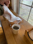 Очень вкусная выпечка, ещё тëплая! Можно прикупить сыр, творог, молоко. А вот с кофе стоит поработать, возможно использовать другое молоко