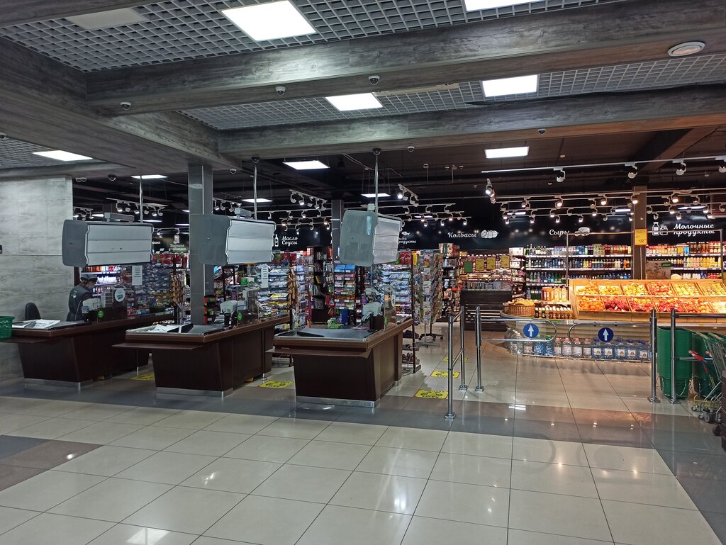 Есть абсолютно всё что нужно. Хороший, вкусный хлеб 🍞 Офигенная жареная курица 🐔 Работает круглосуточно, это несомненно +, в магазине просторно, приятно там находится, персонал нормальный (всегда здороваются), короче 👍
