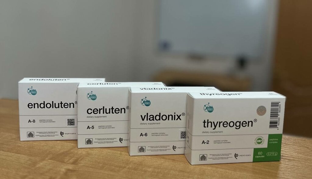 Клинические исследования Натуральные пептиды Хавинсона Владимира Хацкелевича. Разработка Санкт-Петербургского Института биорегуляции и геронтологии. Тиреоген — цитомакс, в состав которого входят пептидные биорегуляторы, выделенные из щитовидной ...