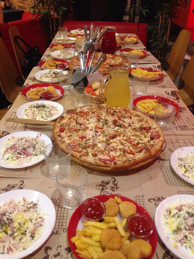 Оказалась в данном заведении проездом. Уйти хотелось с первых же минут. Давно не встречала такое безобразное заведение. Видимо все деньги ушли в роспись потолка. Интерьер более менее свежий, на этом ВСЕ! Сервис нулевой, качество еды нулевое, чистота минус 10. Столы липкие настолько, что влажная салфетка не в силах справиться с этой застарелой грязью, на стульях горы крошек от предыдущих гостей, на столах стоит кувшин с тухлой зловонной водой с подгнившей травой и плюс ко всему мне принесли тарелку плохо помытую, с остатками засохшей еды. Кухня: блюда приготовлены из самых дешевых ингредиентов, что заметно отражается на качестве и вкусе еды. Сама еда холодная. Ребенку принесли шаурму даже не подогретую хоть немного, просто из холодильника. Пицца вообще отдельная история - невнятный соус «кетчонез», сыр, колбаса, само тесто… как в столовой какой то, что никак не вяжется с местом, которое позиционирует себя как «пиццерия». Однозначно больше ни ногой.