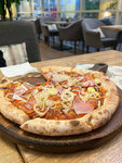 Классическое сочетание, которое нравится многим. На основу из хрустящего теста и нежного томатного соуса мы выкладываем тонко нарезанную ветчину и шампиньоны. Маслины придают блюду деликатный кисловатый вкус (32 см)