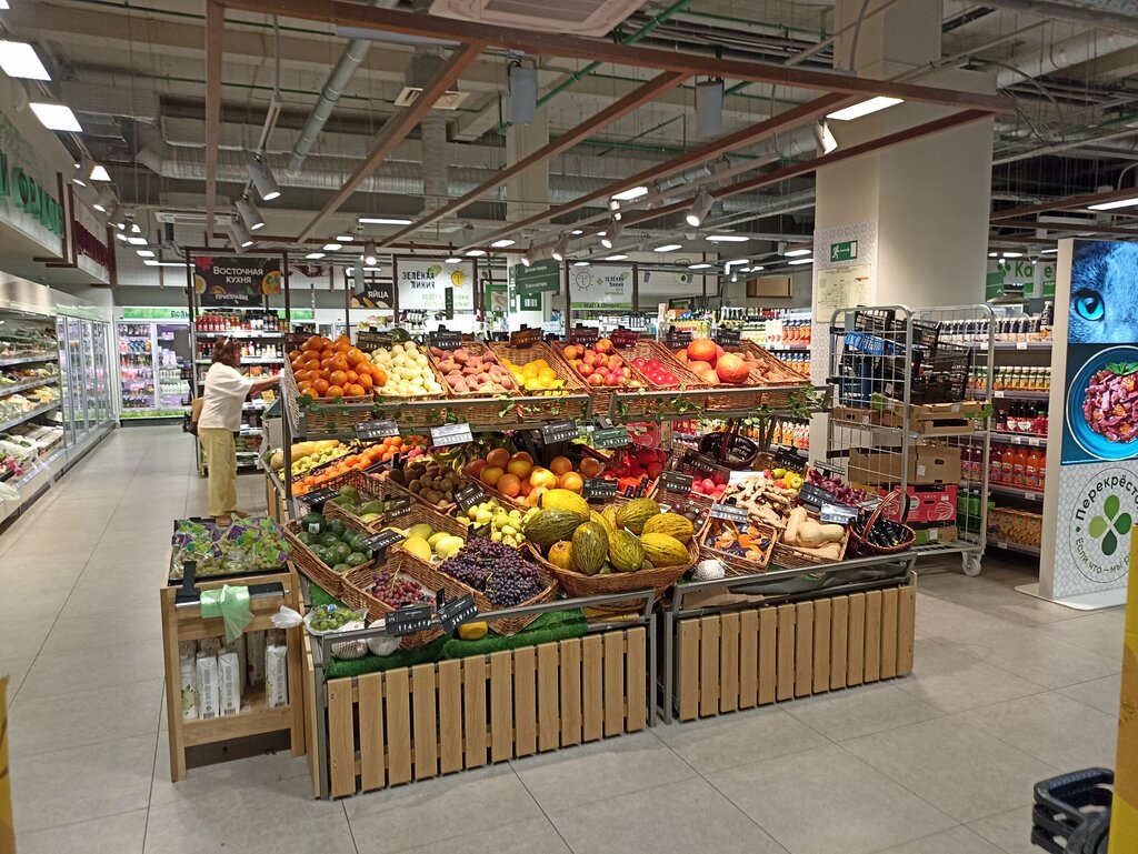 Хорошо, что здесь есть такой сетевой крупный магазин. Большой выбор товаров. Много продуктов из сегмента здорового питания, а также готовых блюд. Готовые блюда разнообразные, есть, что выбрать на свой вкус. Покупали в «Перекрестке» блюда на завтрак и ужин, фрукты, соки, кисломолочную продукцию, когда остановились в апартаментах на Розе Хутор. В самом магазине есть зона кафе (столики, СВЧ), можно поесть и в нем. В магазине чисто, товар разложен аккуратно. Есть кассы самообслуживания.