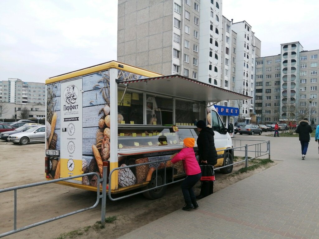 Очень удобно. Авто стоит между двумя большими макетами , не надо идти далеко, можно приобрести и хлеб и булки , пирожные и другую выпечку.