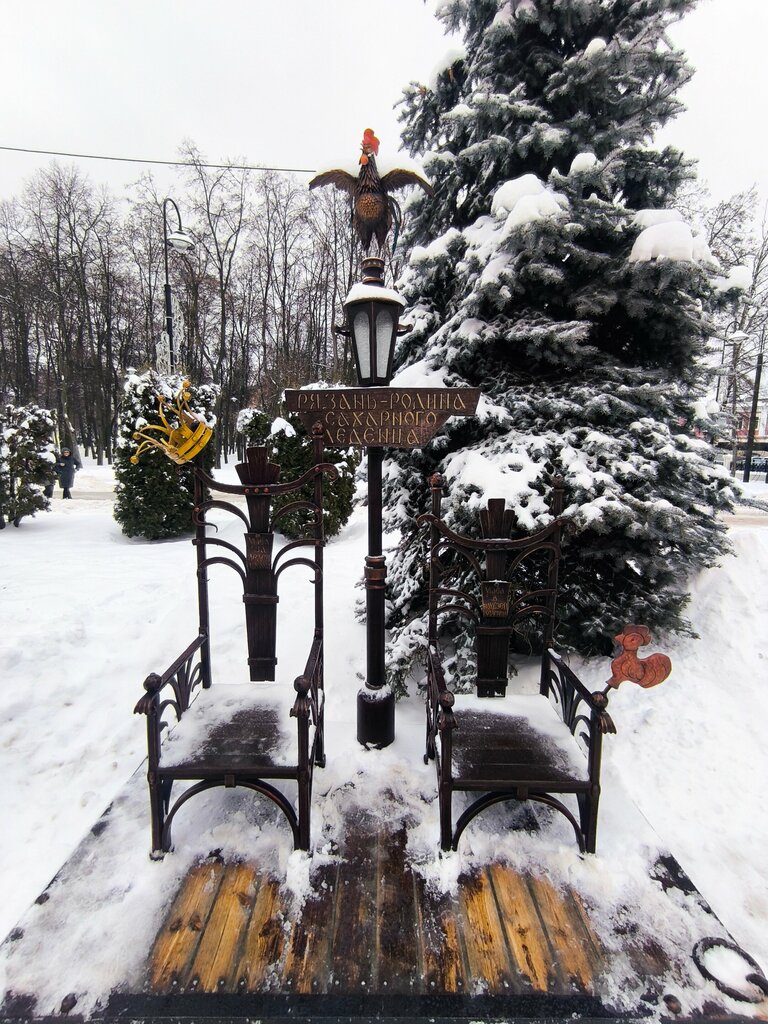 Один из трех тематических арт-объектов, рядом с Рязанским музеем леденца. Это перо счастья петушка (сам петушок – сидит рядом, на арт-объекте с двумя креслами) , который обронил его, находясь наверху. Поскольку перо – не простое, а счастливое, в этом месте советуют подписывать все брачные договоры и оформлять ипотеку))))