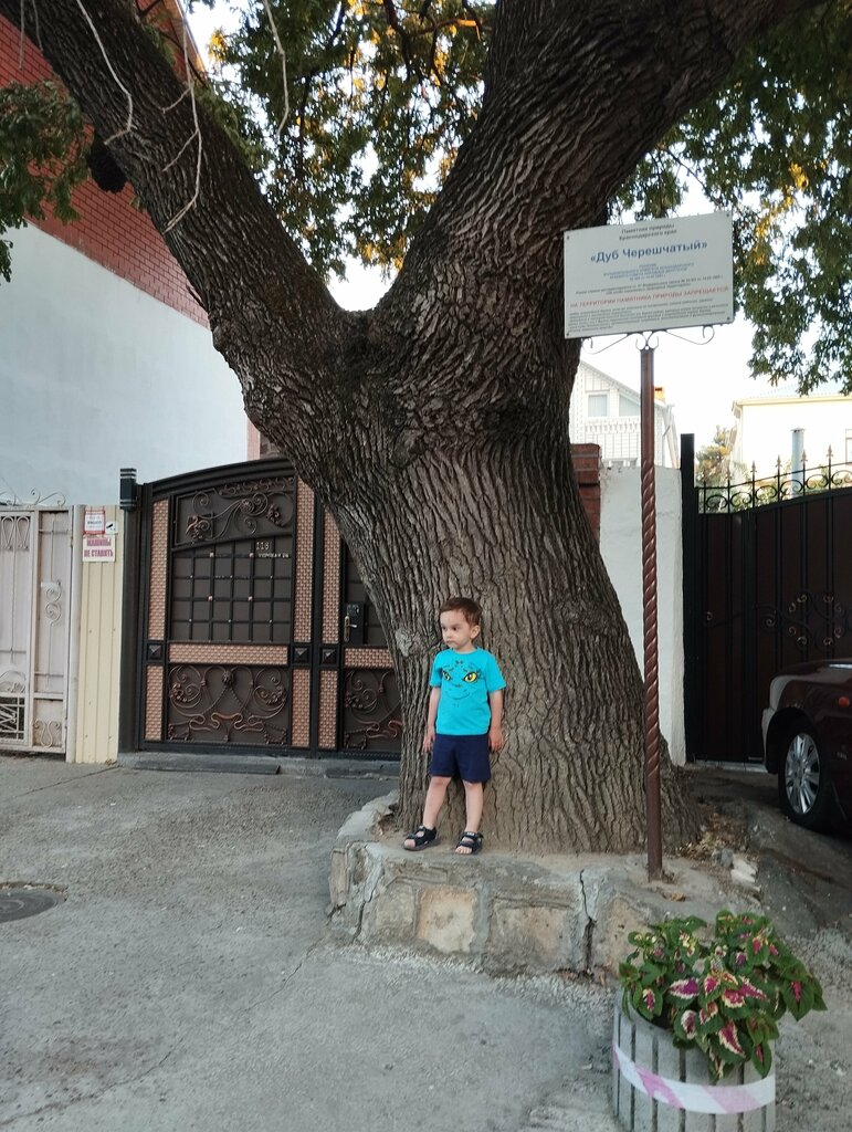 Дуб действительно ооочень старинный и сухой. За ним должного ухода нет. Этим летом 2022 года в июле отвалилась большая сухая ветка, благо это случилось в пять утра и жертв не было, но пострадало две машины. Дуб всё также стоит сухой и не ухоженный, а ветки свисают тяжёлые. Машинам которые пострадали от дуба никто ничего не компенсировал. Выводы близко к дубу не подъезжайте, он опасен.