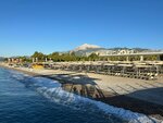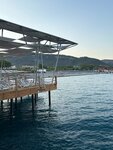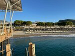 The beach of the Swandor kiris resort. The wide coastline is about 300-400 m long. The entrance is pebbly. Convenient entrance from the shore. There are many sun beds under canopies. There is a bar on the beach. There is a pier with a bar and sun beds. There are 6 descents into the water on the pier, a shower with fresh water.