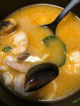 Тайский суп с морепродуктами, грибами и кокосовым молоком. Подается с рисом