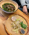 Национальный суп Вьетнамской кухни на говяжьем бульоне с пряными специями, макотью говядины, рисовой лапшой и красным луком. Подается с ростками сои, мятой, лаймом, имбирем, чили-уксусом и черными ферментированными бобами
