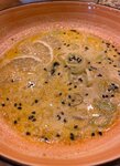 Пикантный тайский суп с азиатскими цитрусовыми специям, тигровыми креветками, кальмаром и мидиями в створках, кокосовым молоком, шампиньонами и томатами черри. Подается с рисом и лаймом