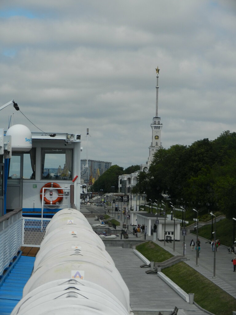 Первый раз теплоход отходил так далеко от Северного вокзала, обычно от 1 или 2 причала, но.... оказалось, это не проблема. От вокзала до дальних причалов ходят бесплатные машинки с прицепами для багажа. Машинок много, ждать не надо.... Водитель сам грузит и разгружает багаж. Очень удобно и приятно. Причал чистый, аккуратный. Очень хорошо все устроено.