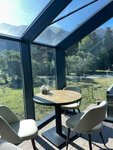 Ресторан потрясающий, это твердая пятера. Начну с входной группы. К ресторану удобный и подъезд и подход. На первом этаже располагается кафе-магазин, где можно купить чай, варенье, хлеб, разнообразные десерты и конфеты ручной работы. Ресторан расположен на втором этаже и состоит из большого зала и двух видовых веранд. Одна веранда выходит на горы, другая на реку Псыш. Здесь готовят очень вкусный кофе. Заказывали разнообразные блюда и все очень красиво и вкусно. От души рекомендую этот ресторан. Здесь только один минус- не наливают))) Халяльный ресторан.