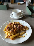 Картофель фри с жареным беконом и луком криспи.