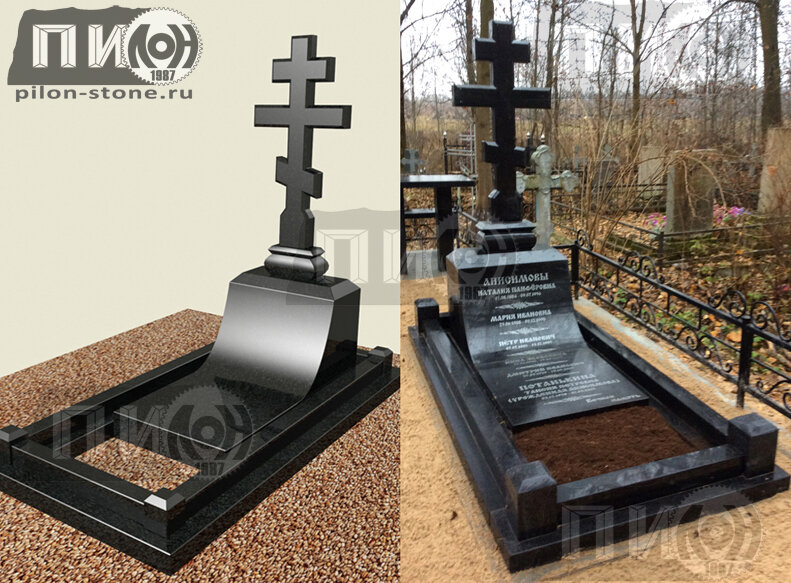 Горизонтальный памятник на двоих с вырезанным крестом СВ-01 производства компании Пилон. В качестве материала можно выбрать 1 из 14 видов гранита. Они отличаются текстурой и цветом. Памятник доступен в нескольких комплектациях: только стела, стела и