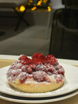 Ягодный флан совсем твёрдый и холодный, недоразмороженный, песочная корзинка ни ложкой, ни вилкой не поддаётся, только кусать. Ягодки малины полуразмороженные холоднющие. Кофе вкусный, удобно, что самой можно выбрать сироп и добавить сколько хочешь, а так же воду, если крепко 🤍
