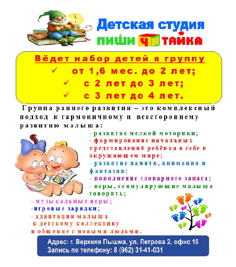 Classes for children:arts and crafts, pictorial art, computers and programming, mathematics, logarithmics, calligraphy and literate, sculpting, drawing with sand, lego lessons, English language, speech development