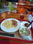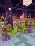 Хорошая русская еда, без всяких хитрых специй. Хорошая посуда. Большой выбор блюд и выпечки. Дополнительно соусы, десерты. Большой зал, много мест. В лиловых тонах. Набор суп, беф с макаронами, компот составил 500 р. С 17-30 до 19 скидка 50%.