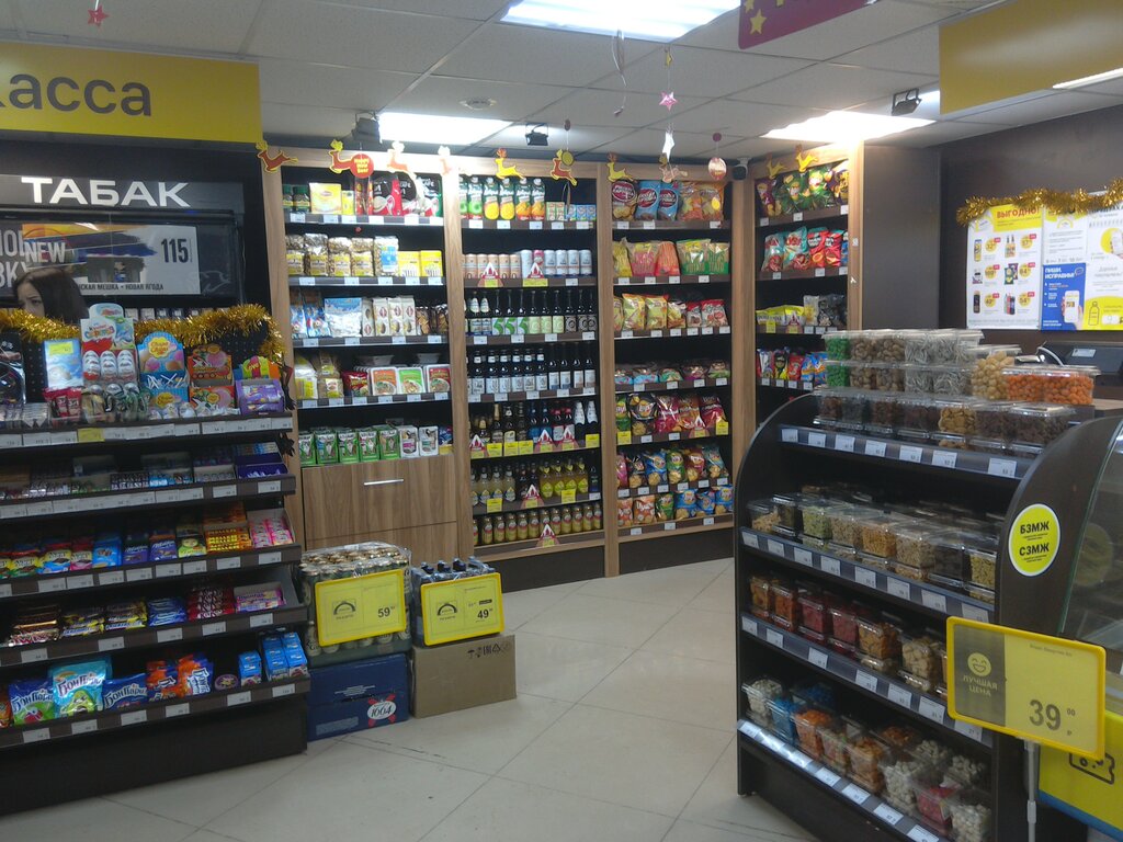 Недорогие цены, большой ассортимент напитков, рыбы, сопутствующих всяких товаров.