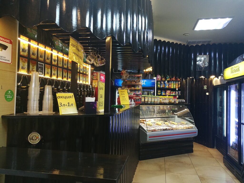 Думал просто магазин розливного пива, а оказался мини паб. 5 узких столиков прямо перед кранами. Пиво недорогое и хорошее. Я взял светлое крепкое и не пожалел. Это не та проспиртованая шляпа, которую продают в розницу. Ещё приятно, что в углу висит телек со включенным каналом муз-тв и ненавязчиво крутит попсу. А если вдруг пробьет на похавать, в этом же зале есть окно в шавермачную. И да, выгоднее там пить на месте, потому что стакан дают бесплатно, а вот за любую бутылку придется доплачивать. Таки все сделано, чтобы удержать клиента в заведении.