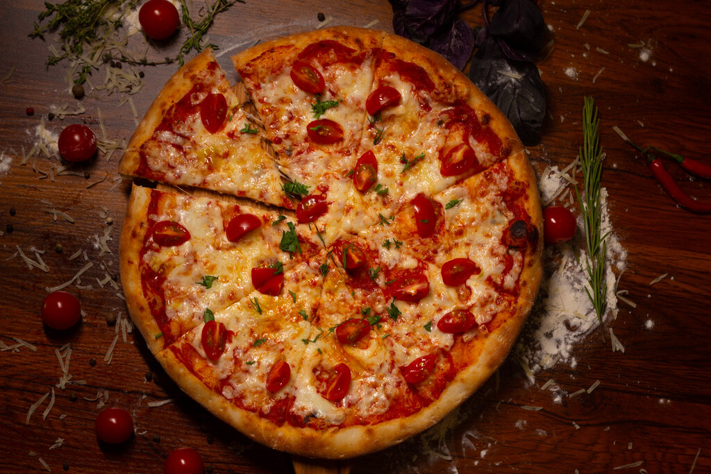 Помидор Черри, Тигровые креветки, Салат Руккола, Сыр Моцарелла, Сыр Пармезан, Томатный соус