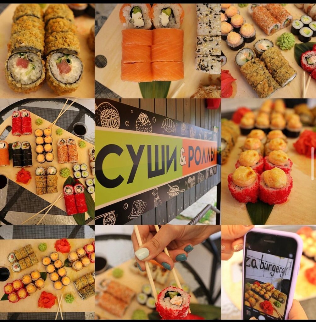 Variety of food:sushi and rolls, сhinese food
