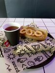 Был впервые, мимо бежал, как обычно. Заказал что-то наподобие завертона, луковые кольца и чай. Чай, потому что кофе... нет! Шок, конечно. Пиццерия без кофе. Ну да ладно. Подали быстро. Завертон нереально маленький. Для сравнения, штатная шаурма в 2,5 раза больше при цене на 100Р дороже. Итого - 520Р за все. Вроде недорого, но через стенку (был) - за меньшие деньги брал манты, овощной салат и салат с кальмара. Далее. Стол - без салфеток. В подаче салфеток также не было. Ну что-то совсем несерьезно. Кольца вкусные. Не хватает соли или соевого соуса (на столе можно ставить - как везде). Ну и с профессиональной точки зрения небольшое наблюдение. Пицца - синица. Зачем за стойкой гигантский паук? Особая зрительная жесть - смазанные или ровные отпечатки ладоней в почти красной краске - будто кто-то изрешеченный на последнем издыхании бежал наружу... Повсюду развешено что-то похожее на вату или что-то вроде того - зачем? У вас же синица - используйте это в интерьере, развейте тематику.