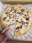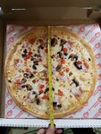 Курьер приехал быстро, был дружелюбный, к нему никаких претензий нет. Сама пицца не понравилась: 1) она меньше заявленного размера в 37 см, по факту у нас была на 1 см меньше, 36 см. (по площади это очень много) 2) В пицце очень мало ингредиентов, она очень тонкая и очень лёгкая. По вкусу средне, мы были расстроены. Думали приедет большая пышная пицца с большим количеством ингредиентов, а приехала тонкая общипленная бедная пицца. 3) Она выглядит бедно и стыдно. Это был первый и последний раз когда мы тут делали заказ. По виду даже помидор целый пожалели, положили несколько кусочков от него!! * Очень похоже на суррогат который продают в магазинах - как замороженные пиццы. НЕ РЕКОМЕНДУЕМ, ОБХОДИТЕ СТОРОНОЙ. У меня язык не повtрнётся называть это "пиццой"... РФ 2026-й год ... и еше за 928 р... :( *на предпоследней фотографии в сравнее с пиццей из другой компании примерно за те же деньги.
