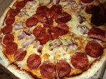 Пепперони, бекон, сыр моцарелла, томатный пицца-соус, орегано, базилик.