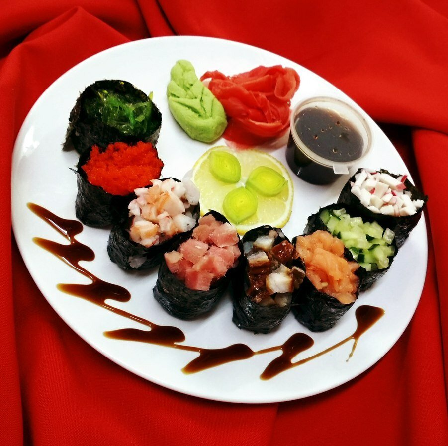 Variety of food:sushi and rolls, pizza, fixed meal