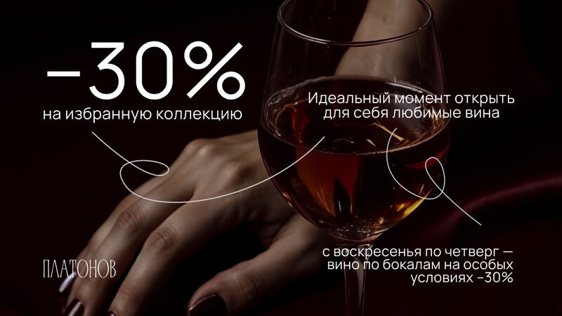 Идеальный момент открыть для себя любимые вина. Специальные цены –30% на избранную коллекцию. С воскресенья по четверг — вино по бокалам н...