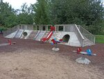 клёвая нестандартная площадка, множество зон для лазания, большой мостик, очень необычно по сравнению с дворовыми площадками