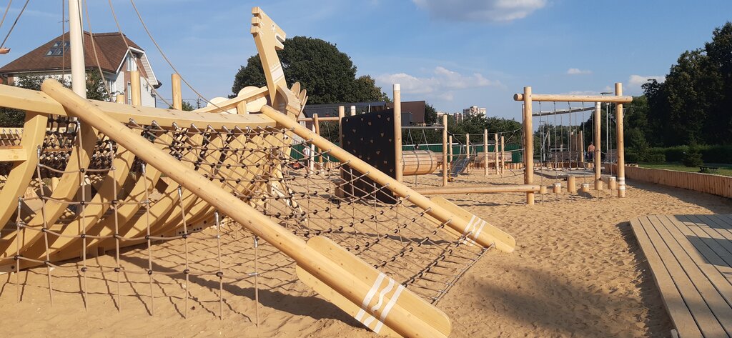Посетили летом 2022г. Хорошая, интересная площадка для детей, интересно было и дошкольникам, и годовасику. Покрытие- хороший песок, вокруг деревянные помосты. Рядом есть туалет, в нем было чисто и даже имелась туалетная бумага) Чего не хватало, так это навесов над скамейками для родителей, в жару очень хочется спрятаться в тени, а её нет.