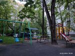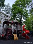 Хорошая площадка: песочница, качели, горка с оснащениями, много лавочек со спинками и деревьев. Расположена между домами.