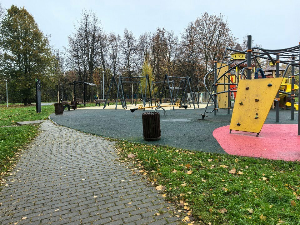 Интересная площадка с множеством качелей,горок, лавочек. Подходит и малыш и детям постарше.