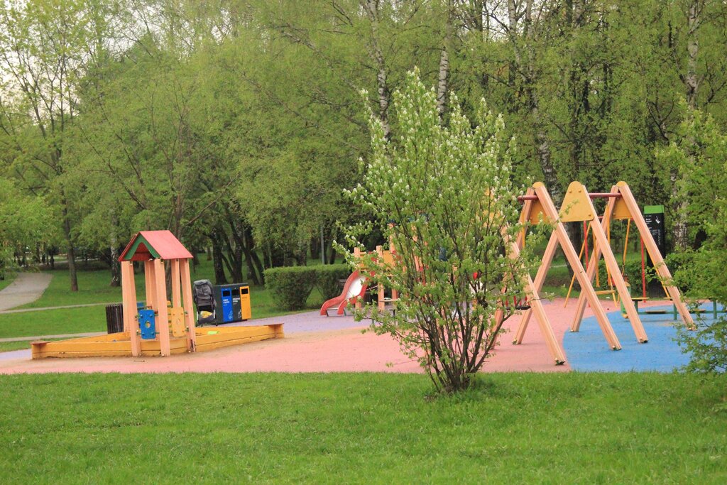 Интересная площадка с множеством качелей,горок, лавочек. Подходит и малыш и детям постарше.