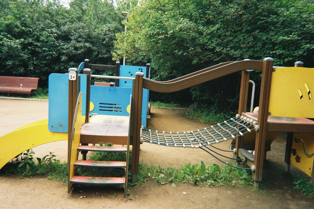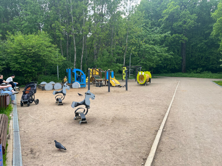 Отличная площадка для совсем маленьких! Низкие горки и лазилки, качели с ограничением.