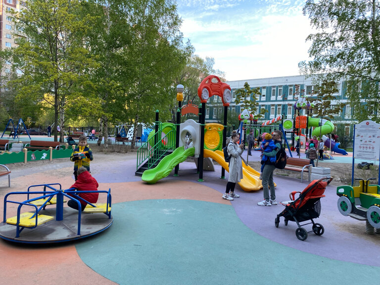 Отличная площадка для детей всех возрастов. Есть все и даже больше: качели обычные, два гнезда, два городка с горками, крутилки, песочница, скалолазание и чего там только нет ❤️ все новое, покрытие, чистота. Лавочки