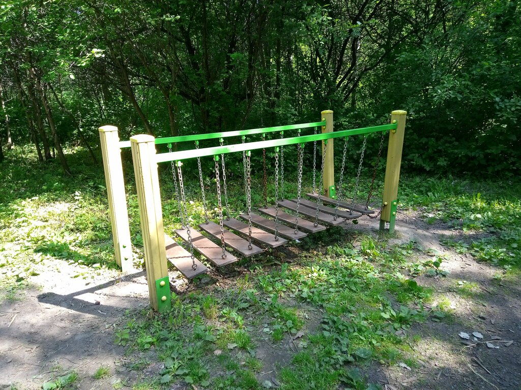 Хорошая скромная детская площадка, есть качели, песочница, подвесной мост, горка, лавочки. Рядом расположена зона для пикника и бак для сбора мусора.