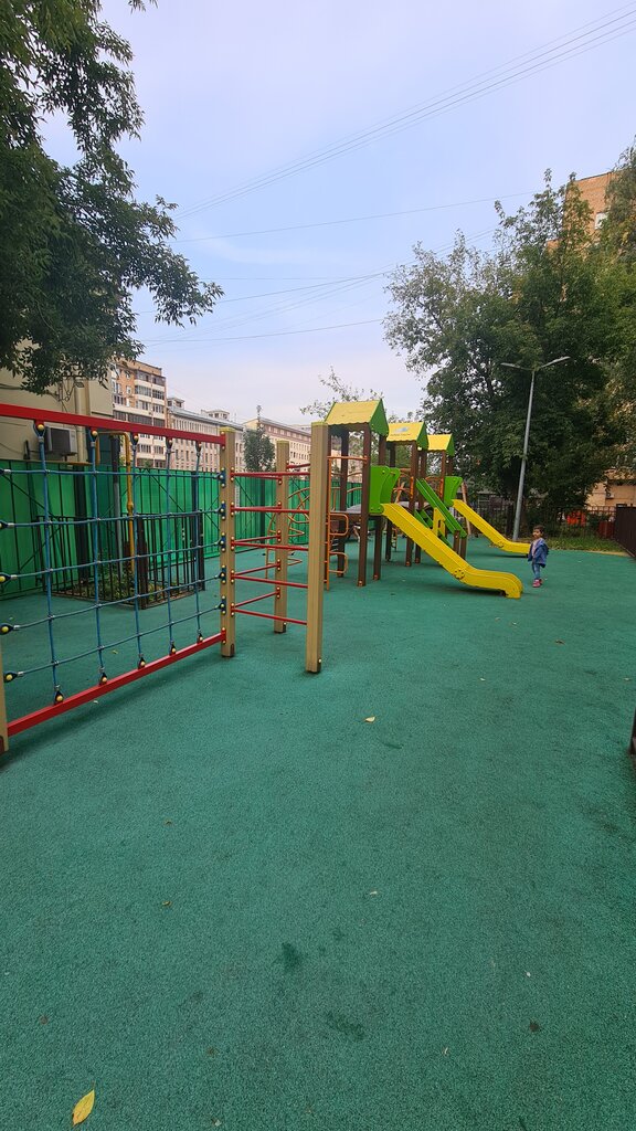 Обычная площадка, не большая. Территория огорождена. 2 горки, качель, песочница, есть детское баскетбольное кольцо.