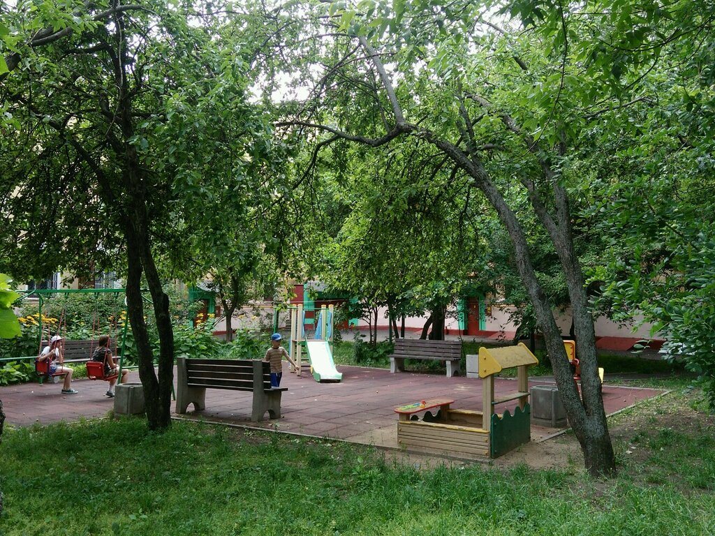 Сам по себе игровой комплекс для детей не представляет из себя ничего особенного: качели, песочница, горка. Но расположен он в одном из старейших сохранившихся в этой части Москвы двориков, среди деревьев, часть которых была высажена ещё в середине прошлого века. К большому сожалению, далеко не все жители района осознают ценность этого уголка: приходя сюда, много мусорят, портят оборудование, летом обрывают яблоки с 3 оставшихся здесь яблонь буквально вместе с ветками.