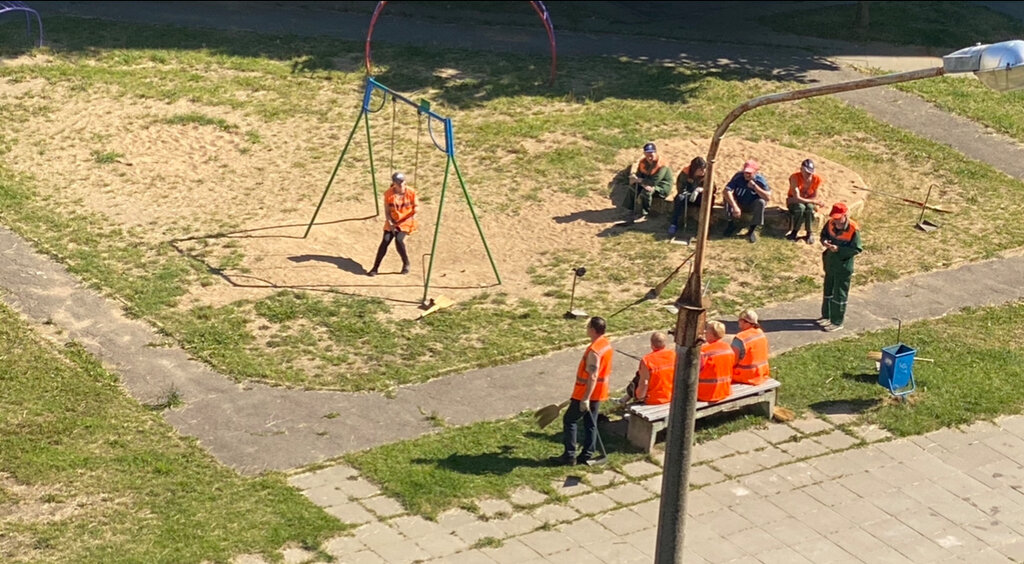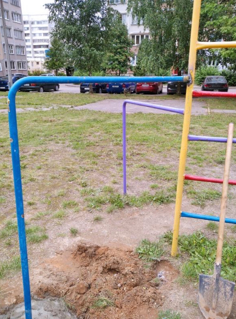 In my opinion, an ordinary Soviet playground, one swing, a lot of climbing rails, houses stand with the letters P and each house has its own playground, in the photo there is a playground with swings, the next (to the right) is with a slide, the next (third) with swings, each has a sandbox and benches for moms. (photo 1 - immediately after the repair (the beam broke - they gave an application at 115 and after 4 hours everything was repaired)) - very quickly (photo 2 - the meeting of the Jes employees takes place daily at 10:00) 😅💪😌