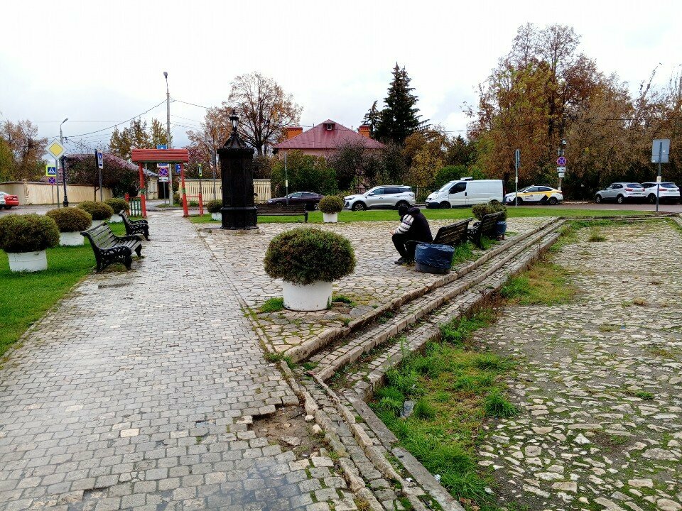 Ничего особенного. Одна горка и деревянная лошадь от музейной фабрики пастилы. Это не игровая площадка, это скорее площадка для отдыха, в центре которой восстановленная колонка, или бассейна, как ее раньше называли.