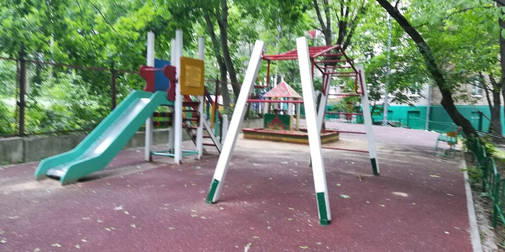 Площадка страшная как и все которые у нас в Москве ставят. Единственное что конкретно у этой расположение во внутреннем дворе и много деревьев и зелено вокруг летом. А так ничего особенного. Пожалуйста сделайте нормальные площадки современные из натуральных материалов и с правильным мягким покрытием