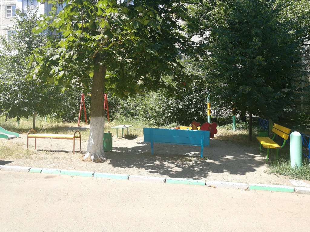 Фотка шикарная. Площадка уютная, лавочки, тень всегда. Гопоты нет, жители дома следят за порядком.