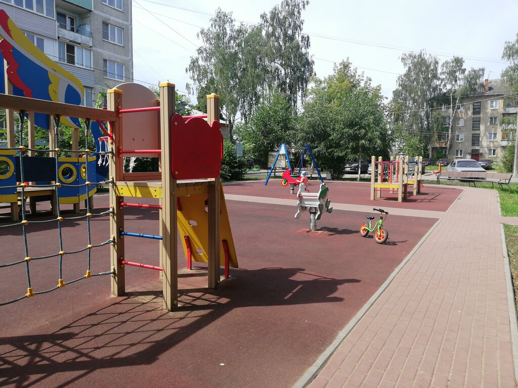 Красивые деревянные игровые конструкции в виде джипа и ладьи. Есть горка, лесенки, баскетбольное кольцо, крутые качели-гамак, хорошие лавочки, мягкое напольное покрытие. В целом - это отличная детская площадка! Детишкам тут нравится.