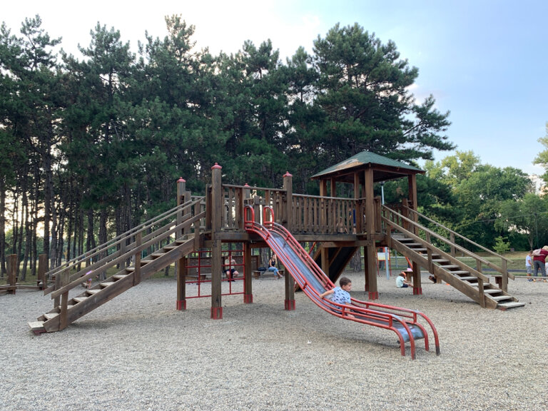 A great playground with small pebbles: a slide, trolls (it's already sagging), a swing, a music playground