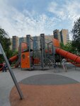 Отличная необычная площадка, большой игровой комплекс с горками и лазалками. Часто приезжаем сюда играть с ребенком. Есть деревья с тенечком для родителей, есть лавочки.